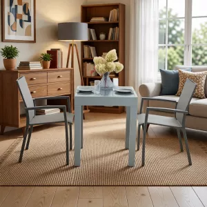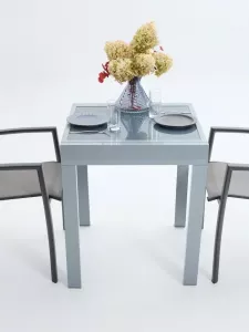 Стол: Прочная столешница из закаленного стекла обеспечивает легкость в уходе и устойчивость к царапинам. Основание стола выполнено из легкого и прочного алюминия с порошковым покрытием, что гарантирует долговечность и защиту от коррозии.