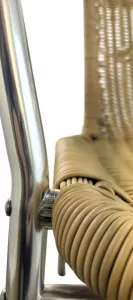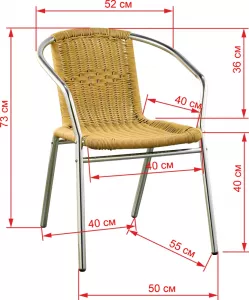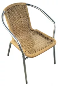 Стул алюминиевый. Каркас: алюминиевая труба, стянутая болтами, полированная до зеркального вида. Параметры трубы: D25мм, толщина стенки 1.2мм. Сиденье и спинка: капроновый прут (D2.8мм, угловое плетение) - имитация ротанга. Стулья стопируемые. В стопке 21 шт. Характеристики