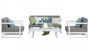 Материалы и цвета: каркас мебели выполнен из всесезонного алюминия с порошковым покрытием белого цвета, подушки спинок и сидений обшиты уличной тканью голубовато серого цвета (А13806) с водоотталкивающей пропиткой, толщина подушек 12 см, столешница кофейного столика глянцевая, изготовлена из закаленного стекла толщиной 5 мм с нанесением белого цвета с помощью шелкотрафаретной печати.