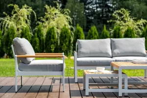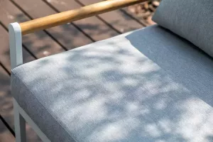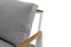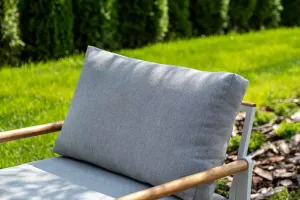 Дополняют конструкцию элементы из массива тика. Мягкие элементы мебели выполнены из водоотталкивающей ткани Олефин.