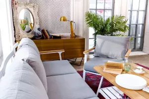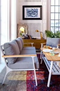 Комбинация каркаса матового белого цвета с подлокотниками из натурального тика и спокойного тона глубоких и удобных подушек дает запоминающийся комплект садовой мебели, который займет достойное место на любой веранде.
