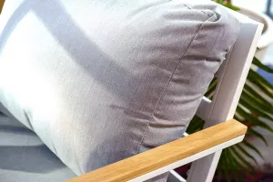 Это стиль и элегантность на вашей веранде. Материал алюминий, цвет каркаса белый, подлокотники натуральный тик. Подушки в комплекте , ткань подушек Олефин, цвет подушек темно-серый