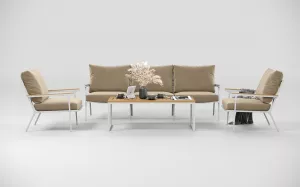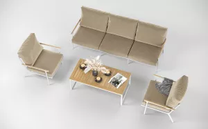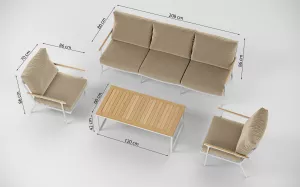 Материалы и цвета: каркас мебели выполнен из всесезонного, долговечного алюминия с порошковым покрытием белого цвета, планки столешницы и подлокотники дивана и кресел изготовлены из благородного тика, удобные подушки спинок и сидений обшиты премиальной уличной тканью бежевого цвета. Ткань устойчива к ультрафиолетовому излучению, водостойкая. Толщина подушек 12 см. Чехлы съемные.