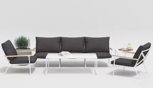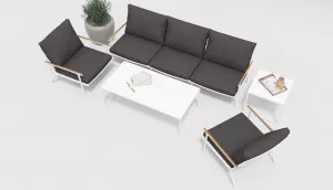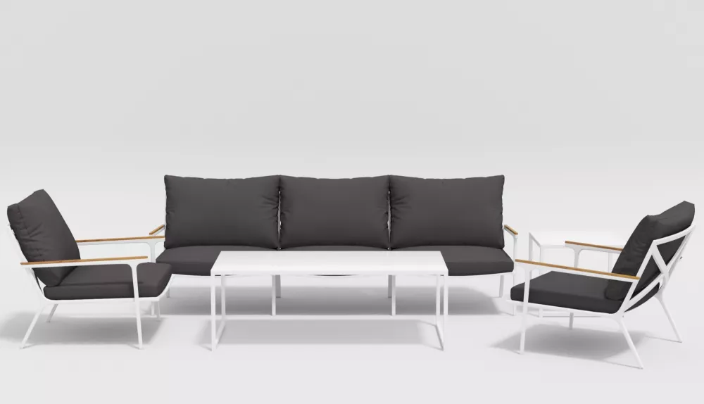 Материалы и цвета: каркас мебели выполнен из всесезонного алюминия с порошковым покрытием белого цвета, подлокотники кресел и дивана декорированы вставками из тика, подушки спинок и сидений обшиты уличной тканью темно-серого цвета (А13805) с водоотталкивающей пропиткой, толщина подушек сидений 10 см, столешница кофейного и журнального столиков глянцевая, изготовлена из закаленного стекла толщиной 5 мм с нанесением белого цвета с помощью шелкотрафаретной печати.