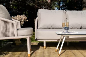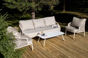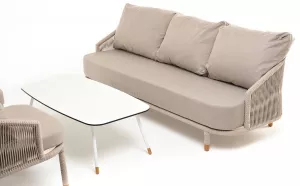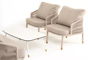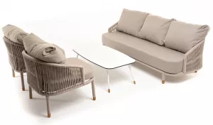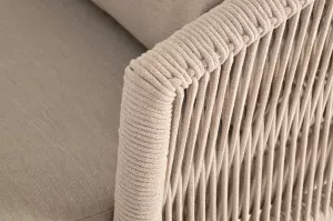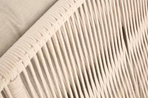 Каркас уличной мебели выполнен из износостойкого алюминия. Его дополняет бежевая ручная оплетка, изготовленная на основе эластичных синтетических лент из полиэфирных волокон высокой прочности (роупа).