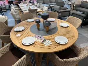 Отделка стола настолько качественная, что вы можете провести по ней рукой, и она кажется цельным куском дерева. Поставляются в комплекте с гранитным сервировочным подносом (включая поворотную фурнитуру). Тик премиального качества.