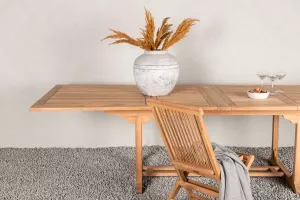 Раздвижной стол из тикового дерева с механизмом бабочки. Идеально подходит для большой компании из 10-12 человек. За счет ширины 110 см даже с торцов может комфортно разместиться по два человека. На нижней стороне имеются легко снимаемые металлические застежки, которые удерживают механизм двойного выдвижения на месте по всем направлениям.