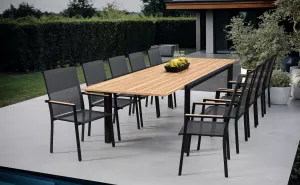 Большой раздвижной стол + 10 штабелируемых кресел . Подстолье выполнено из алюминия, а верх из тикового дерева. Вся конструкция прочная и элегантная. Классические цвета означают, что они сочетаются со многими нашими стульями, независимо от того, какую комбинацию вы предпочитаете.