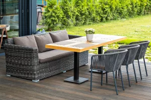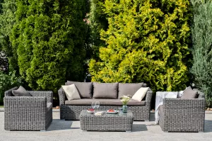 Диван из искусственного ротанга в своей основе имеет каркас из алюминия, который оплетен вручную круглым плетением графитового цвета.