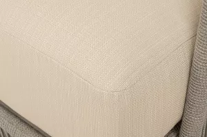 Диван имеет алюминиевый каркас, окрашенный порошковой краской в светло-серый (RAL7035) цвет. Боковины каркаса и спинка вручную оплетены роупом - эластичными синтетическими лентами, изготовленными из высокопрочных полиэфирных волокон. Цвет оплетки - серый меланж.