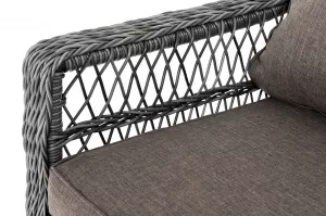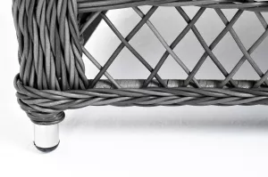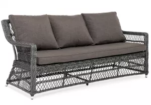 Модель выполнена с помощью ручного круглого плетения из искусственного ротанга. Трехместный диван представлен в графитовом цвете.