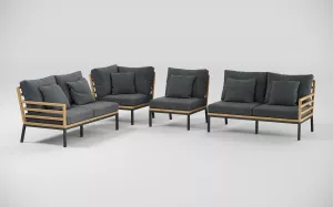 Материалы и цвета: каркас диванов изготовлен из тика, подножье выполнено из всесезонного, долговечного алюминия с порошковым покрытием темно - серого цвета (карбон), подушки спинки и сидений обшиты премиальной уличной тканью темно - серого цвета. Ткань устойчива к ультрафиолетовому излучению, водостойкая. Толщина подушек 12 см. Чехлы съемные. Каркас стола изготовлен из алюминия, столешница из тиковых планок
