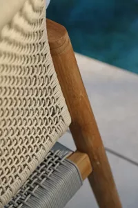 Алюминиевый каркас спинки сиденья кресла, ножки из тикового дерева FSC + олефиновая веревка, подушка на сиденье с наполнителем из быстросохнущей пены, солнцезащитная ткань.