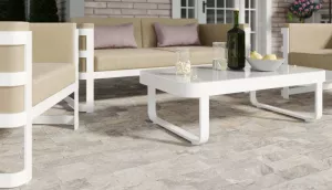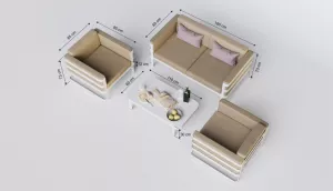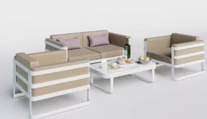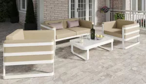 Материалы и цвета: каркас мебели выполнен из всесезонного алюминия с порошковым покрытием белого цвета, подушки спинок и сидений обшиты уличной тканью золотисто бежевого цвета (А13809) с водоотталкивающей пропиткой, толщина подушек 12 см, столешница кофейного столика глянцевая, изготовлена из закаленного стекла толщиной 5 мм с нанесением белого цвета с помощью шелкотрафаретной печати.