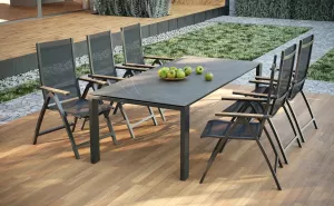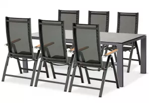Это роскошные столы со столешницей из спеченного камня. Спеченный камень это новейший продукт современных инноваций, он изготовлен из порошка натурального камня. Таким образом, столешница очень прочная. Материал устойчив к атмосферным воздействиям, устойчив к царапинам и к экстремальным температурам. В комплекте 6 регулируемых складных кресел с тиковыми подлокотниками (61хг66хв115/67/45см). Характеристики