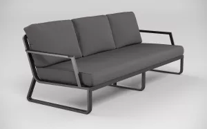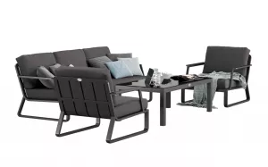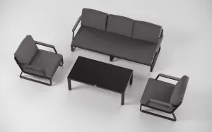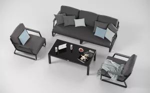Материалы и цвета: каркас мебели выполнен из всесезонного алюминия с порошковым покрытием темно - серого цвета (карбон), подушки спинок и сидений обшиты уличной тканью темно - серого цвета (A 13805) с водоотталкивающей пропиткой, толщина подушек 12 см, столешница кофейного столика глянцевая, изготовлена из закаленного стекла толщиной 5 мм с нанесением черного цвета с помощью шелкотрафаретной печати.