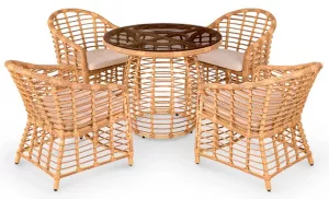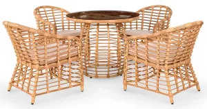 Готовый комплект объединяет четыре просторных кресла и круглый стол в едином дизайнерском решении. Лаконичные линии, комфортная посадка и выразительная структура плетения создают атмосферу уюта и гармонии. Комплект подходит как для частных террас и зон у бассейна, так и для коммерческих пространств кафе, отелей, лаунж-зон. Характеристики