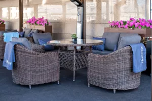 Подушки выполнены из водостойкой полиэфирной ткани для защиты мебели от дождя и солнца