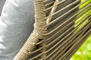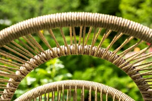 Каркас изготовлен из стали, окрашенного порошковой износостойкой краской бежевого цвета. Оплетка плоский искусственный ротанг соломенного оттенка. Материал устойчив к перепадам погоды и подходит для использования на открытых пространствах.