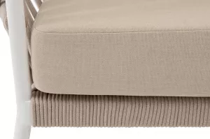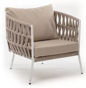 Кресло имеет алюминиевый каркас, окрашенный порошковой краской в белый цвет. Боковины каркаса вручную оплетены роупом - эластичными синтетическими лентами, изготовленными из высокопрочных полиэфирных волокон. Цвет оплетки - бежевый.