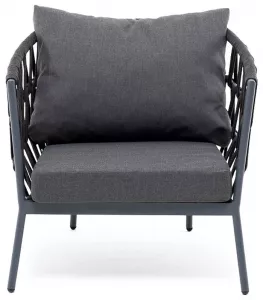 Кресло имеет алюминиевый каркас, окрашенный порошковой краской в темно-серый (RAL7024) цвет. Боковины каркаса вручную оплетены роупом - эластичными синтетическими лентами, изготовленными из высокопрочных полиэфирных волокон. Цвет оплетки - темно-серый.