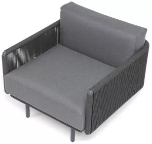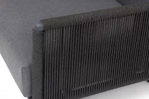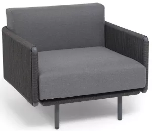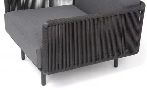 Каркас изготовлен из алюминия и покрыт порошковой краской темно-серого цвета (RAL7024), что повышает устойчивость к атмосферным воздействиям. Боковины каркаса вручную оплетены роупом эластичными синтетическими лентами, выполненными из прочных полиэфирных волокон.