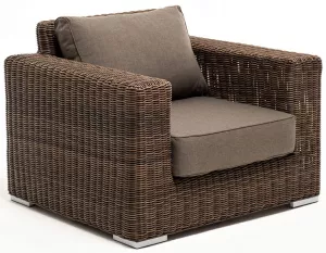 Кресло оснащено каркасом из прочного алюминия, ручное круглое плетение является основным декоративным элементом мебели. Оно выполнено из искусственного ротанга в коричневом цвете.