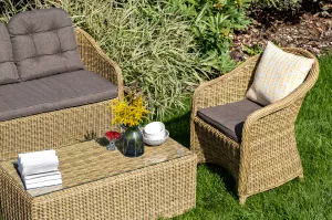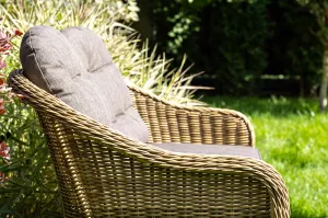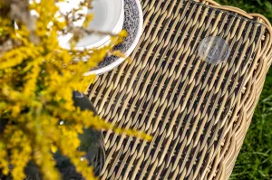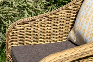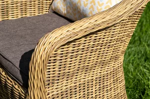 Комплект выполнен из круглого искусственного ротанга соломенного цвета. Каркас - из легкого и прочного алюминия. Подушки со съёмными чехлами - из 100% полиэстера, плотностью 300гр/м2 с влагоотталкивающей пропиткой.