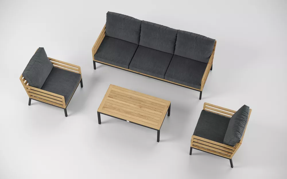 Материалы и цвета: каркас дивана и кресел изготовлен из тика, подножье выполнено из всесезонного, долговечного алюминия с порошковым покрытием темно - серого цвета (карбон), подушки спинки и сидений обшиты премиальная уличной тканью темно - серого цвета. Ткань устойчива к ультрафиолетовому излучению, водостойкая. Толщина подушек 12 см. Чехлы съемные. Каркас кофейного столика изготовлен из алюминия, столешница из тиковых планок