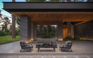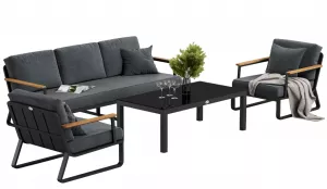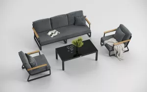 Материалы и цвета: каркас мебели выполнен из всесезонного, долговечного алюминия с порошковым покрытием темно - серого цвета (карбон), подлокотники дивана и кресел изготовлены из благородного тика, подушки спинок и сидений обшиты премиальной уличной тканью темно - серого цвета. Ткань устойчива к ультрафиолетовому излучению, водостойкая. Толщина подушек 12 см. Чехлы съемные. Столешница кофейного столика глянцевая, изготовлена из закаленного стекла толщиной 5 мм с нанесением черного цвета с помощью шелкотрафаретной печати.