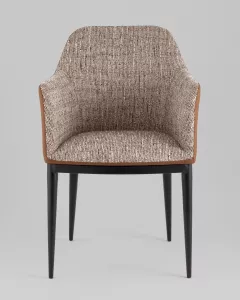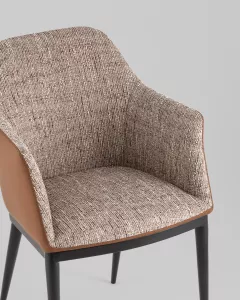 Сиденье и внутренняя часть спинки обтянуты тканью рогожка прочным, дышащим материалом с характерной текстурой. Наружная часть спинки выполнена из коричневой экокожи, устойчивой к истиранию и простого в уходе. Чёрные металлические ножки добавляют модели устойчивости и визуальной строгости. Стул выдерживает нагрузку до 120 кг.