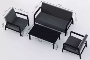 Материалы и цвета: каркас мебели выполнен из всесезонного алюминия с порошковым покрытием темно-серого цвета (карбон), подушки спинок и сидений обшиты уникальной уличной тканью Sunbrella темно-серого цвета, не выгорающей на солнце, толщина подушек сидений 15 см, планки столешницы кофейного столика темно-серого цвета (карбон) изготовлены из прочного алюминия толщиной 10 мм.