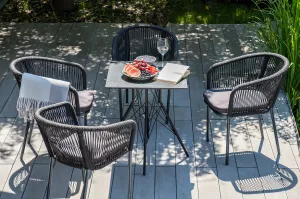 4 кресла выполненных из алюминиевого каркаса и ручной оплетки роупом. Это эластичные синтетические ленты из высокопрочных полиэфирных волокон, представлены в темно-сером цвете.