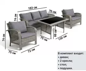 Комплектация: диван 3-х местный, 2 кресла, стол, подушки