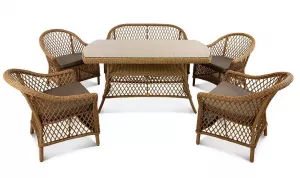 Полноценная гостиная под открытым небом: диван, четыре кресла и стол образуют гармоничную композицию, где каждая деталь продумана для комфорта. Глубокие сиденья, обволакивающие формы и выразительное ромбовидное плетение создают атмосферу расслабленного уюта.