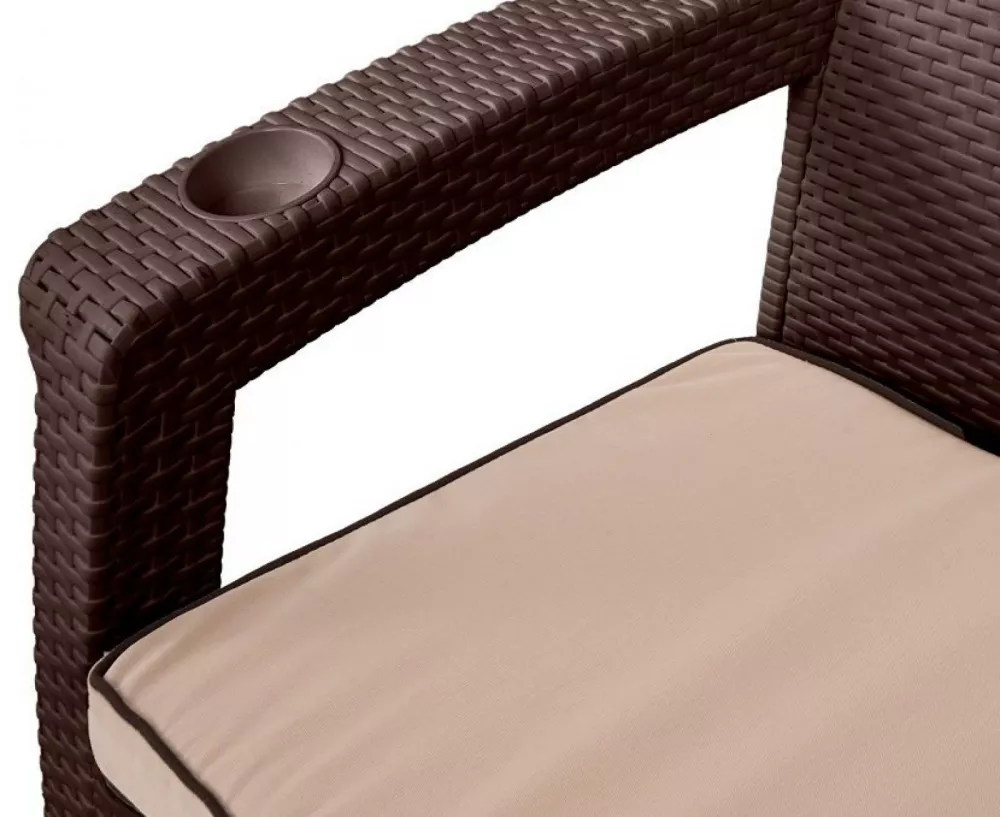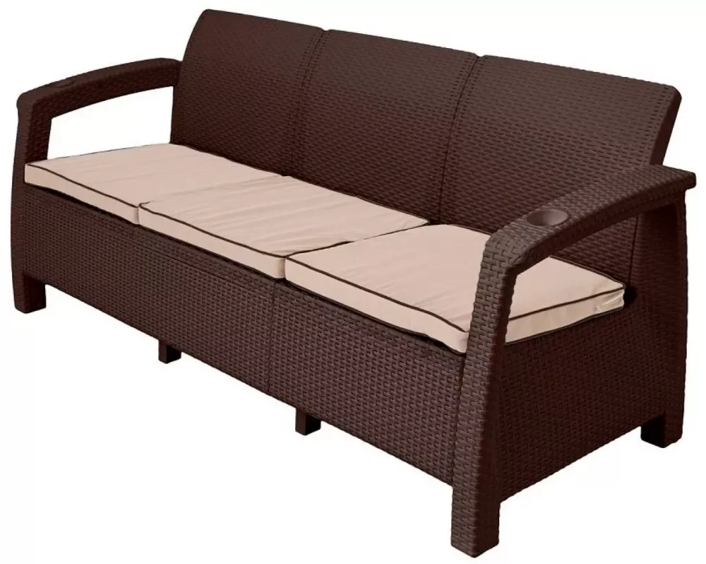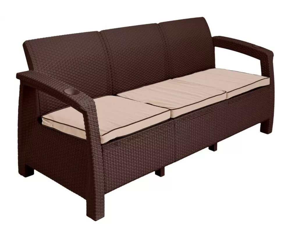 Пластиковый диван трехместный с имитацией ротанга, не имеет металлического каркаса. Не боится дождя, снега и разрушающих солнечных лучей. Простой уход - мебель моется обычной водой, не впитывает грязь. Поставляется в разобранном виде. Размер упаковки 120 х 82 х 37 см Характеристики