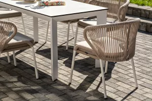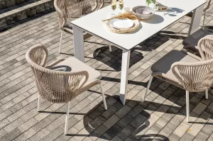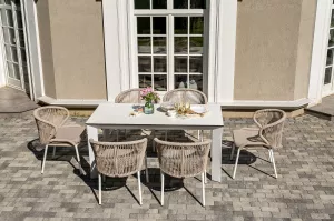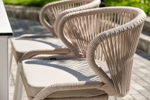 Плетеные стулья выполнены из роупа бежевого цвета, который гармонируют с общим дизайном комплекта. Размер каждого стула составляет 570Ч620Ч795 мм. Каркас из алюминия придает стульям легкость и прочность, а порошковое окрашивание защищает металл от коррозии и увеличивает срок службы мебели.