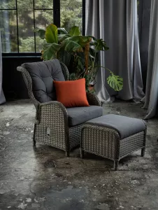 Комплект из 5-ти предметов из искусственного ротанга и алюминия / откидная спинка, подушка для сиденья толщиной 10 см, мягкая подушка для спины и декоративная подушка; регулируемая спинка с цилиндром; столик со стеклом