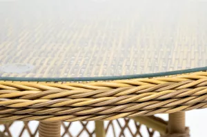 Столешница покрыта прочным стеклом, толщиной 5 мм. Благодаря высокопрочным материалам, обеденный стол очень практичный и подходит для всесезонного использования даже на улице.
