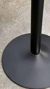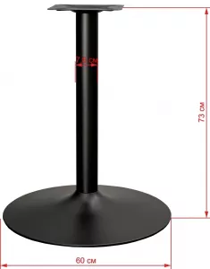 Черное матовое (порошковое напыление). Основание "рюмочкой". Диаметр основания: 60 см, диаметр трубы: 7,6 см, размер верхней площадки: 25х25 см. Рекомендуемый размер столешницы: D-90, 80х80. Характеристики