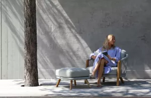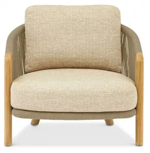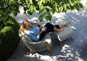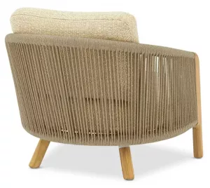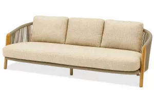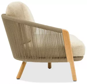 Алюминиевый каркас, ножки из тикового дерева FSC + олефиновая веревка, подушка с наполнителем из пенополиуретана, солнцезащитная ткань.