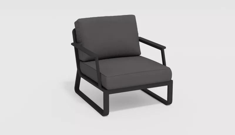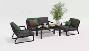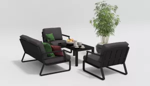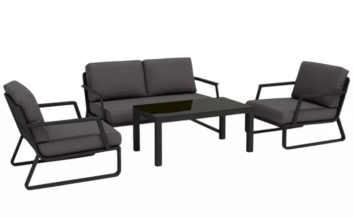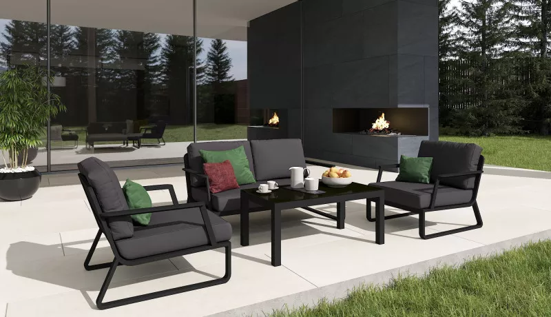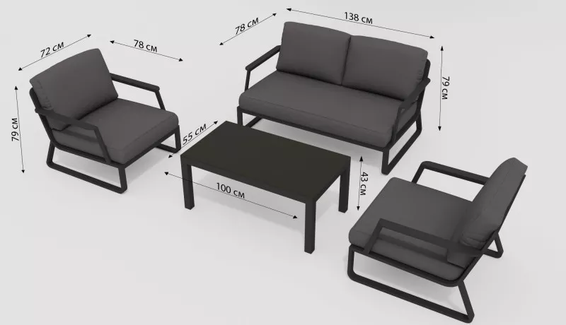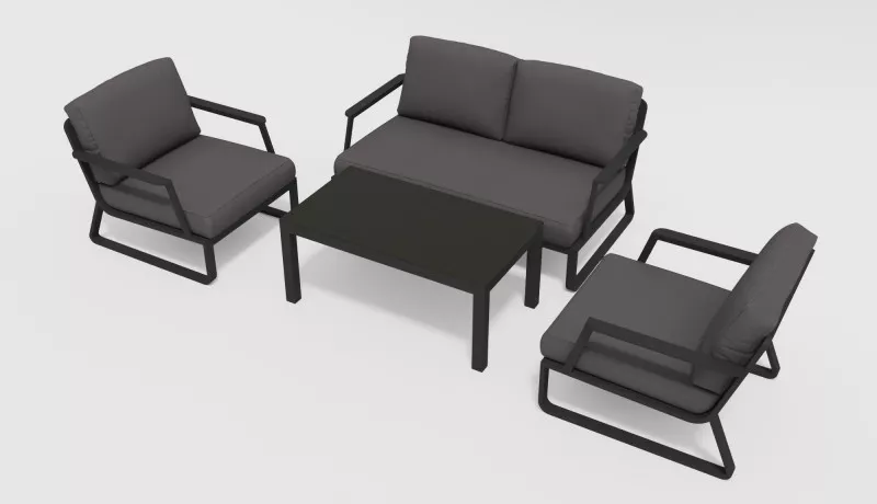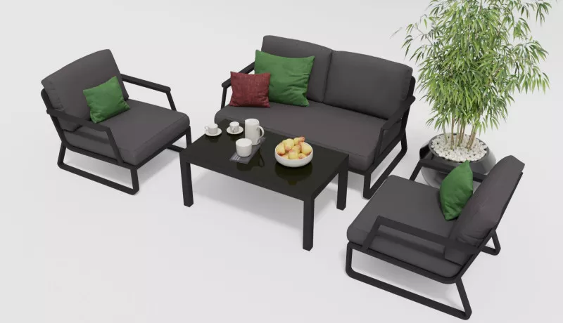 Материалы и цвета: каркас мебели выполнен из всесезонного алюминия с порошковым покрытием темно-серого цвета (карбон), подушки спинок и сидений обшиты уличной тканью темно-серого цвета (А13805) с водоотталкивающей пропиткой, толщина подушек 12 см, столешница кофейного столика глянцевая, изготовлена из закаленного стекла толщиной 5 мм с нанесением черного цвета с помощью шелкотрафаретной печати.