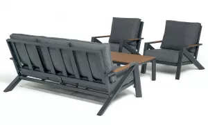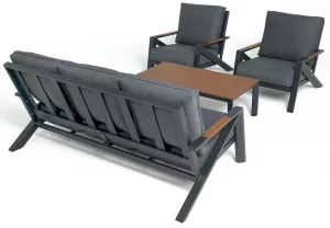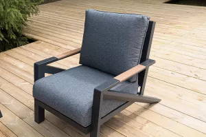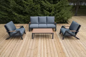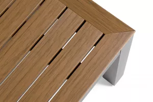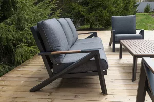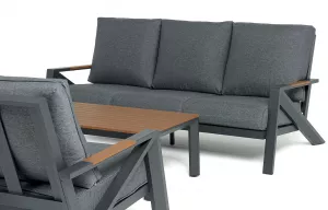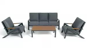 Каркас мебели выполнен из прочного алюминия темно-серого цвета. На подлокотниках дивана и двух кресел установлен облицовочный материал из древесно полимерного композита (ДПК) цвет «дерево». Крепление к каркасу осуществляется на болтах с пластиковыми заглушками темно-серого цвета, которые не ржавеют. Комплект дополняют подушки со съёмными чехлами. Материал чехлов - 100% полиэстер плотностью 190гр/м2.