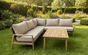 - Игра фактур: Богатое сочетание гладкого массива акации стола, рельефного темно-серого ротанга соф и пышных подушек Олефин с фактурой рогожки создает глубокий тактильный опыт, приятный телу.