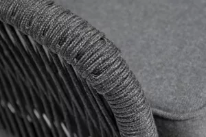 Диван имеет алюминиевый каркас, окрашенный порошковой краской в темно-серый (RAL7024) цвет. Боковины каркаса вручную оплетены роупом - эластичными синтетическими лентами, изготовленными из высокопрочных полиэфирных волокон. Цвет оплетки - темно-серый.
