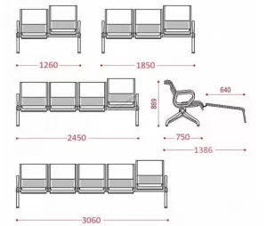 метал. каркас труба 50х50, Ш38, пл/ов. 40х20, 30х15; перф. сиденья с накладн. мягкими элементами, 4 подлокотника.подставка для ног рассчитывается дополнительно и добавляется к стоимости секции