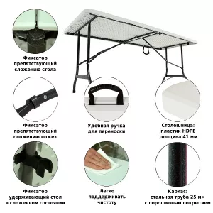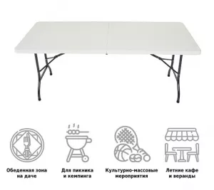 Стол складной подойдет как для выездного обслуживания, так и для кафе или дачи. За ним можно собраться большой и дружной компанией (до 8 человек), чтобы приятно провести время на свежем воздухе. Изделие выполнено из качественного пластика с каркасом из стали и складывается в одно движение. В собранном состоянии не занимает много места, поэтому его удобно как хранить, так и транспортировать.