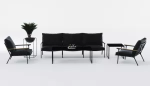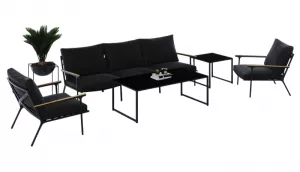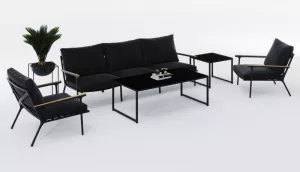 Материалы и цвета: каркас мебели выполнен из всесезонного алюминия с порошковым покрытием темно-серого цвета (карбон), подлокотники кресел и дивана декорированы вставками из тика, подушки спинок и сидений обшиты уличной тканью черного цвета (А13814) с водоотталкивающей пропиткой, толщина подушек сидений 10 см, столешница кофейного и журнального столиков глянцевая, изготовлена из закаленного стекла толщиной 5 мм с нанесением черного цвета с помощью шелкотрафаретной печати.
