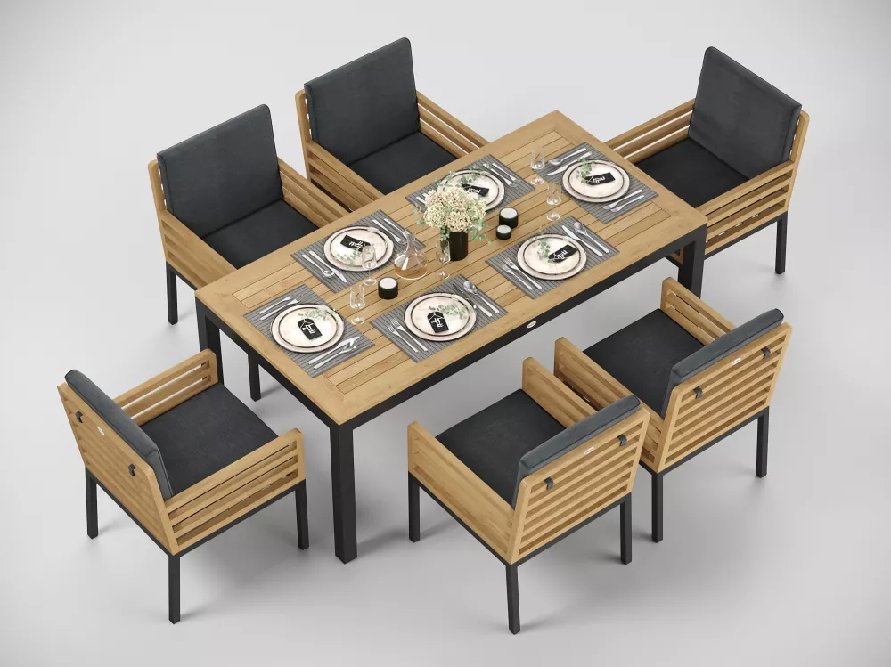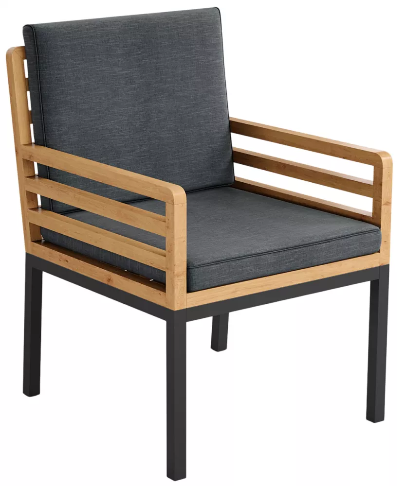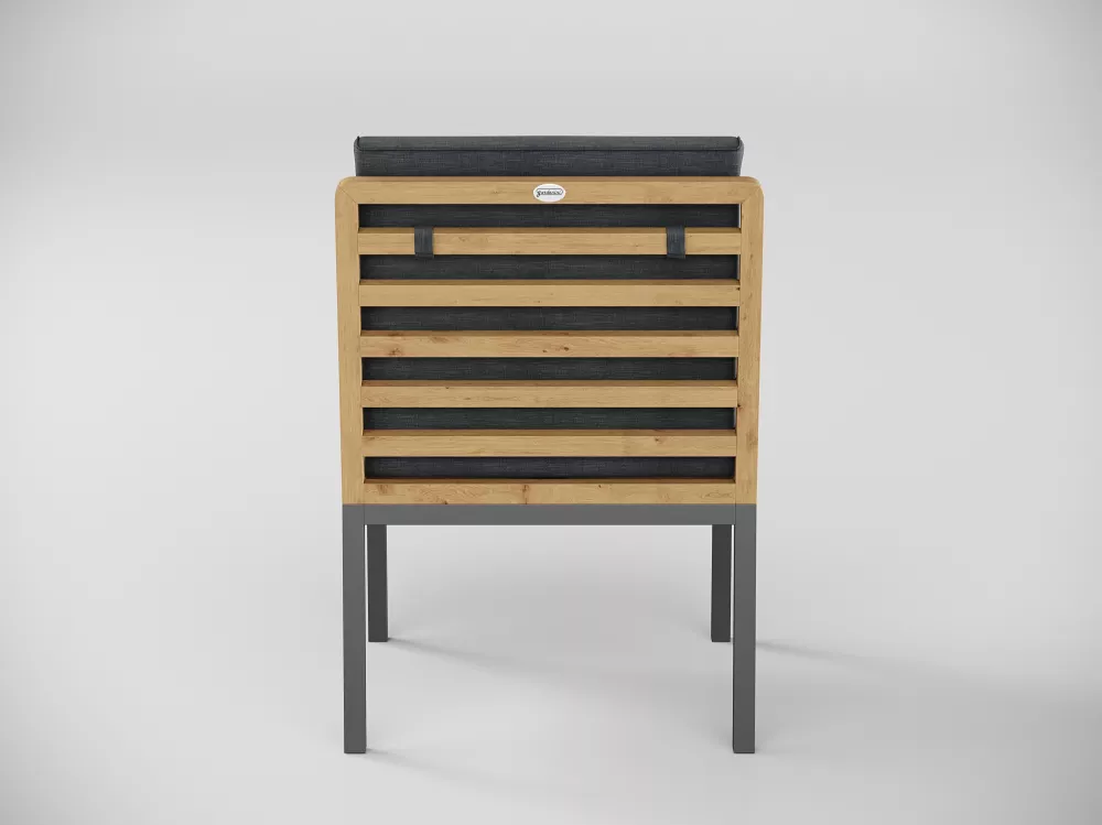 Материалы и цвета: каркас стула изготовлен из тика, подножье выполнено из всесезонного, долговечного алюминия с порошковым покрытием темно - серого цвета (карбон), подушки спинки и сидений обшиты премиальной уличной тканью темно - серого цвета. Ткань устойчива к ультрафиолетовому излучению, водостойкая. Толщина подушек 5 см. Чехлы съемные.