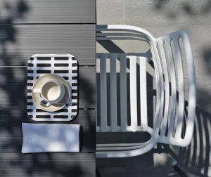 Свежая, легкая и эргономичная. Это новая очаровательная коллекция уличной мебели: Кресла с подлокотниками и без них, кресло для отдыха и моноблочный журнальный столик из стеклопластика (полипропилен и стекловолокно). Вся коллекция была вдохновлена решетчатым дизайном, но Рафаэлло Галиотто, ее дизайнер, придал ей современный оттенок. Плавные линии спинки и сиденья стульев характеризуются игрой заполнений и пустот, отмеченных последовательностью горизонтальных планок.
